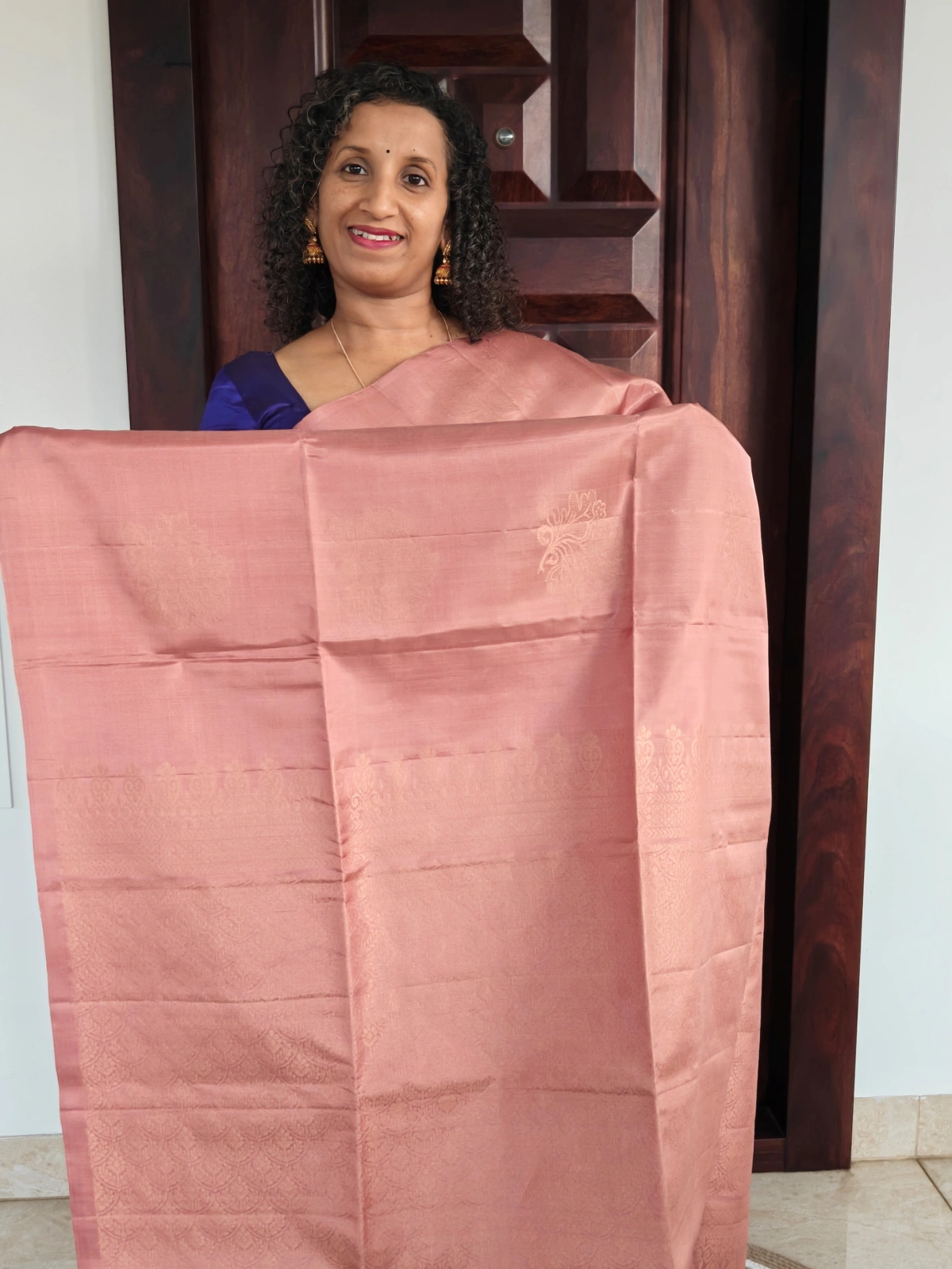 Dusty Peach Pink Kanchipuram Soft Silk Saree with Gold Woven Buttas Silk Mark Certified