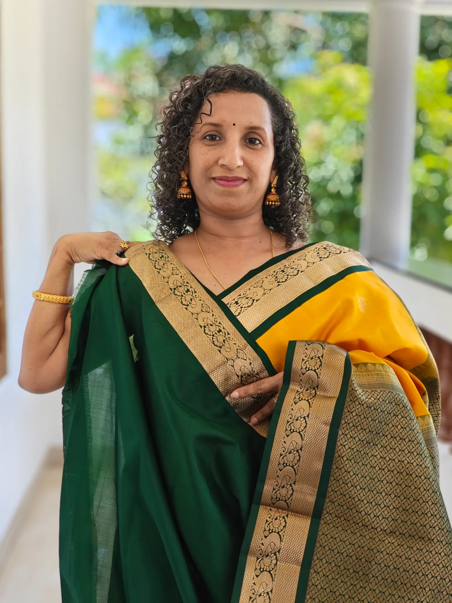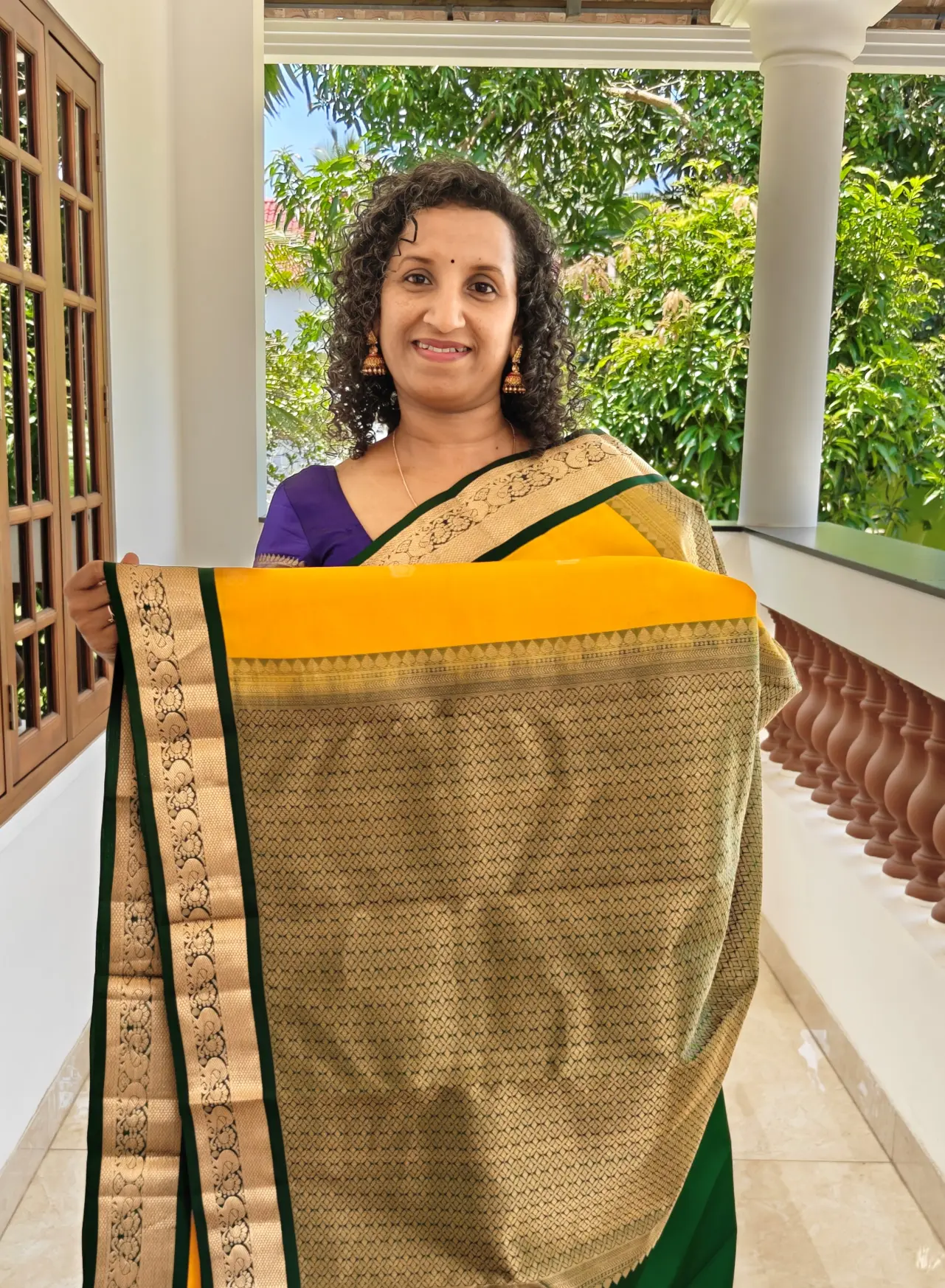 Style Tip: Pair this mango yellow & bottle green Kanchipuram saree with temple gold jewellery, classic jhumkas, and jasmine flowers for an elegant traditional look.
