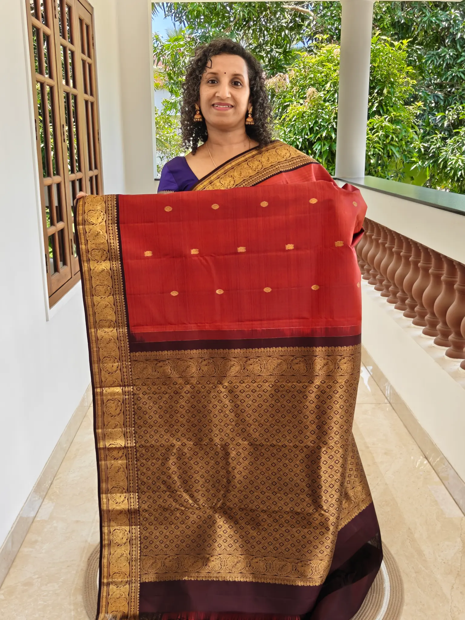 This saree has crafted from pure silk with silk mark certified. The classic contrast of warm reddish orange and deep coffee brown makes it an ideal choice for weddings, festive celebrations, temple ceremonies, and special occasions.