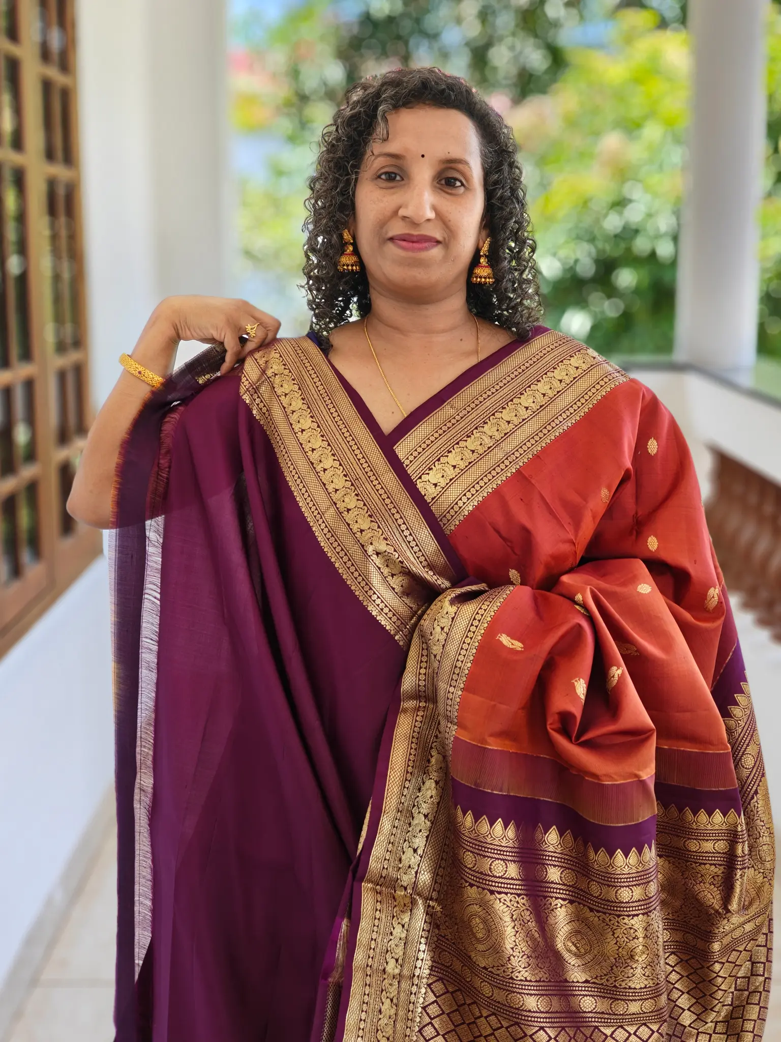The Rich Rust Orange with Deep Plum Border accented with antique gold Zari buttas and borders, giving this saree a classic temple-style elegance. This Traditional Kanchipuram Silk Saree is a timeless expression of South Indian heritage, crafted with pure silk and authentic 1-gram Zari weaving. The rich rust orange body is beautifully adorned with subtle gold Zari buttas, creating a refined and graceful look.